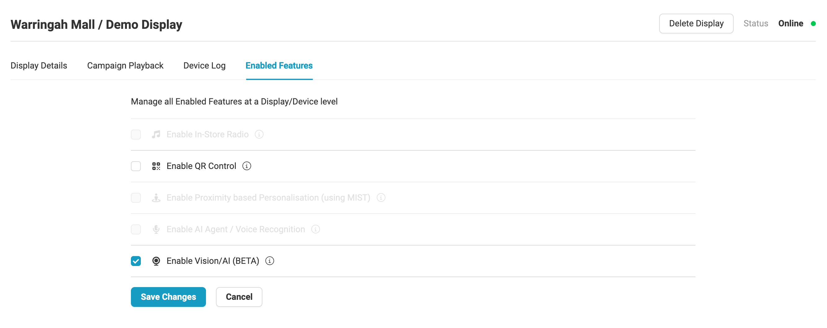 Vision requires that you have a webcam connected to the display. The computer vision model runs at the Edge (no sensitive data leaves the local device/player).